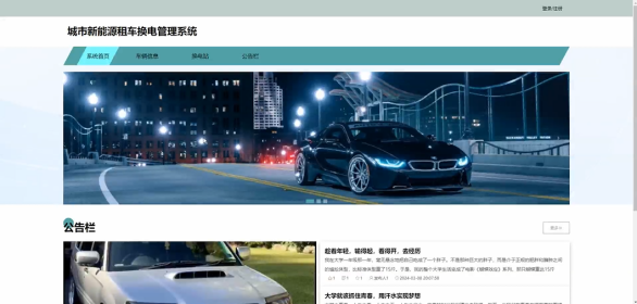 系统首页(轮播图、公告栏、车型快筛、换电站地图入口)