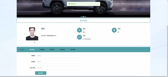 个人中心:在个人中心页面可以对修改密码、车辆租赁、租赁还车、换电请求、我的收藏等信息进行修改;个人中心页面如图5-4所示: