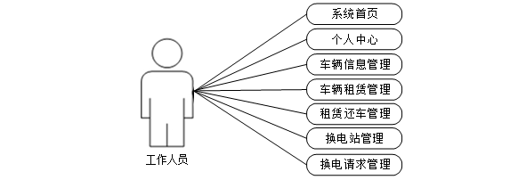 (4)工作人员可以对系统首页、个人中心、车辆信息管理、车辆租赁管理、租赁还车管理、换电站管理、换电请求管理等进行基本的信息管理。其用例分析如图3-4所示。