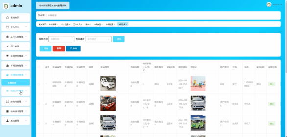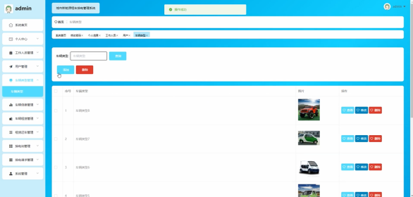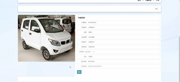 车辆信息管理(编号、名称、类型、品牌、图片、当前电量、简介、年限、小时单价、状态、租车须知、发布时间)