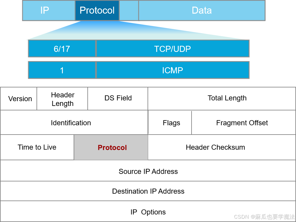 PS:目的端的网络层在接收并处理报文以后,需要决定下一步对报文该做如何处理。IP报文头中的协议字段标识了将会继续处理报文的协议。与以太帧头中的Type字段类似,协议字段也是一个十六进制数。该字段可以标识网络层协议,如ICMP(Internet Control Message Protocol,因特网控制报文协议),也可以标识上层协议,如TCP(Transmission Control Protocol,传输控制协议,对应值0x06)、UDP(User Datagram Protocol,用户数据报协议,对应值0x11)。