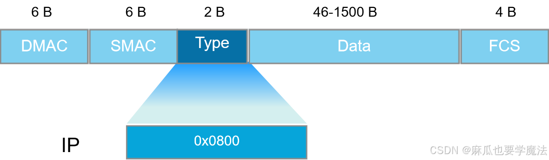 以太网帧中的Type字段值为0X0800,表示该帧的网络层协议为IP协议。