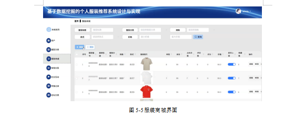 管理员在服装商城页面查询、添加或删除等服装商城信息。内容包括服装编号、服装标题、服装分类、规格、款式、服装照片、服装详情、单限、库存、点击次数等信息,服装商城页面如图5-5所示。