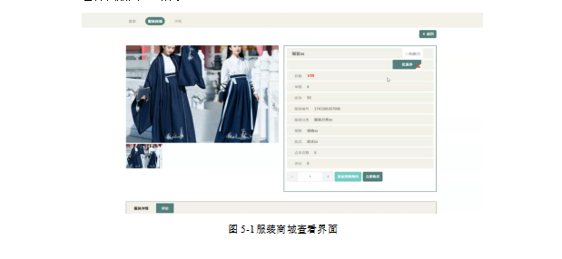 用户在服装商城查看页面可以查看服装商城,并根据服装标题、价格关键词等条件筛选数据。展示的数据包括服装编号、服装标题、服装分类、规格、款式、服装照片、服装详情、单限、库存、点击次数、评论数、评分、价格等,还可以点击添加到购物车、立即购买优惠券或者收藏评论等操作。服装商城查看界面如图5-1所示。