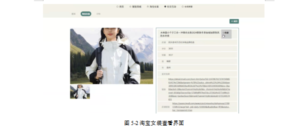 管理员在淘宝女装页面查询、爬取数据、添加或删除等淘宝女装。内容包括标题、店铺、图片、价格、评价、销量、省、市、是否包邮、链接、店铺链接等信息,淘宝女装界面如图5-6所示。
