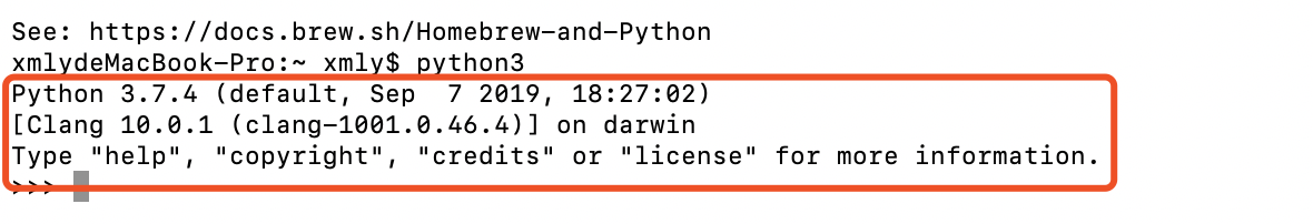 终端输入指令:python3,显示下图信息即安装成功