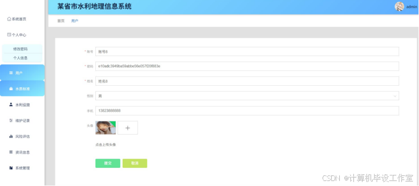 管理员凭固定的管理账户和密码进行登录使用系统;可以管理用户,编辑和更新用户信息,还可以进行某个用户的查询;在个人中心页面进行个人资料和登录密码的修改;编辑水质标准进行发布;管理水利设施;查看维护记录以及风险评估详情,并且进行数据统计展示;发布资讯内容和设置系统轮播图等。
