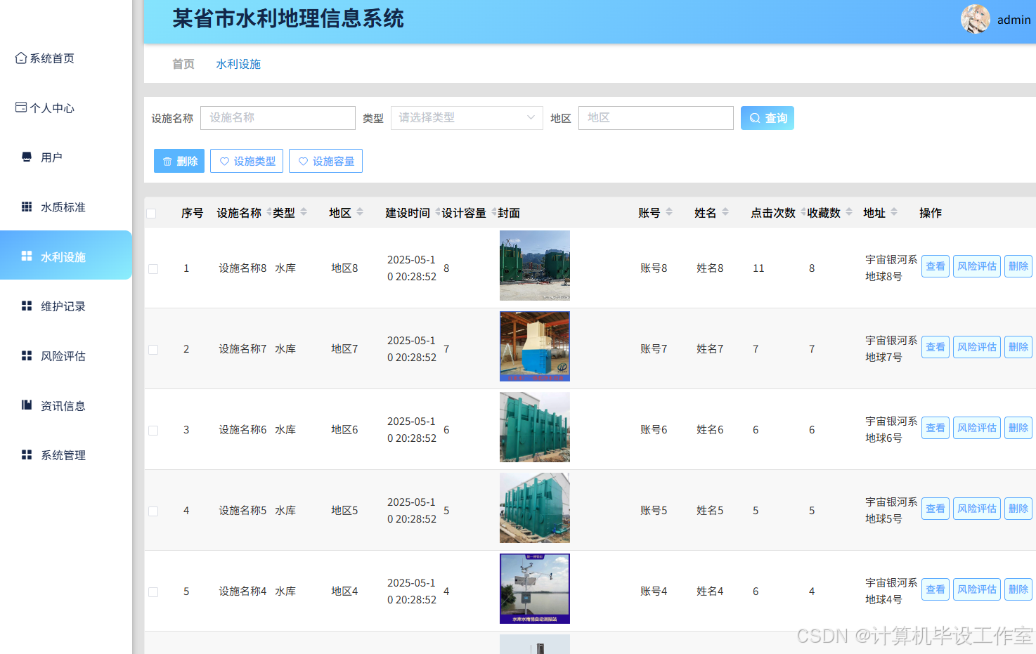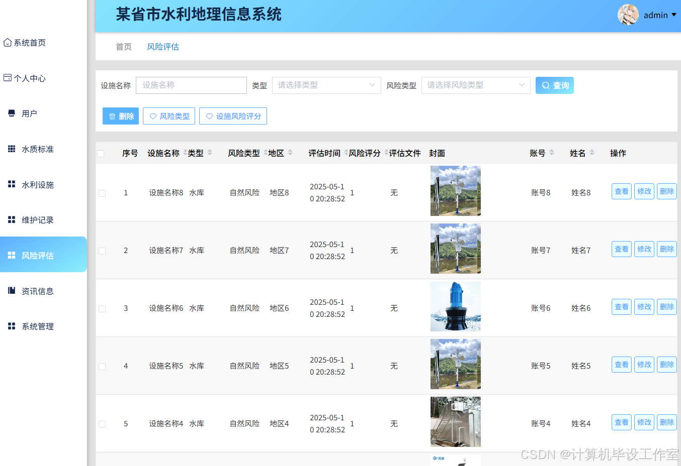 管理员可以通过专门的风险评估管理界面,查看所有用户提交的设施风险评估数据,获取详细的报告列表。在该界面中,管理员能够筛选、排序和搜索特定的风险评估记录,以便快速定位关键信息。风险评估界面如图5-12所示。