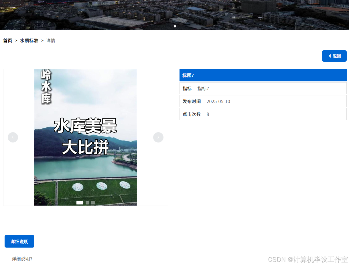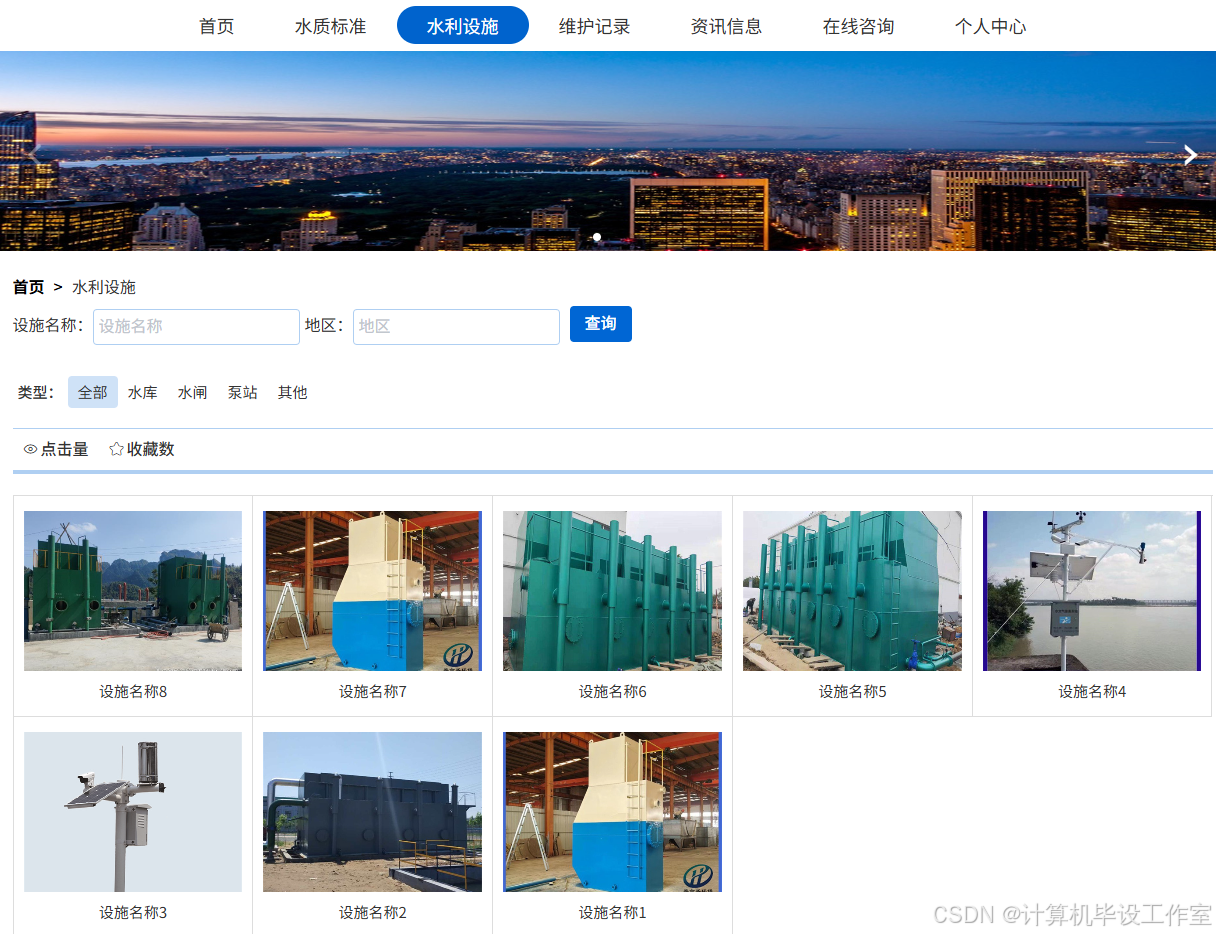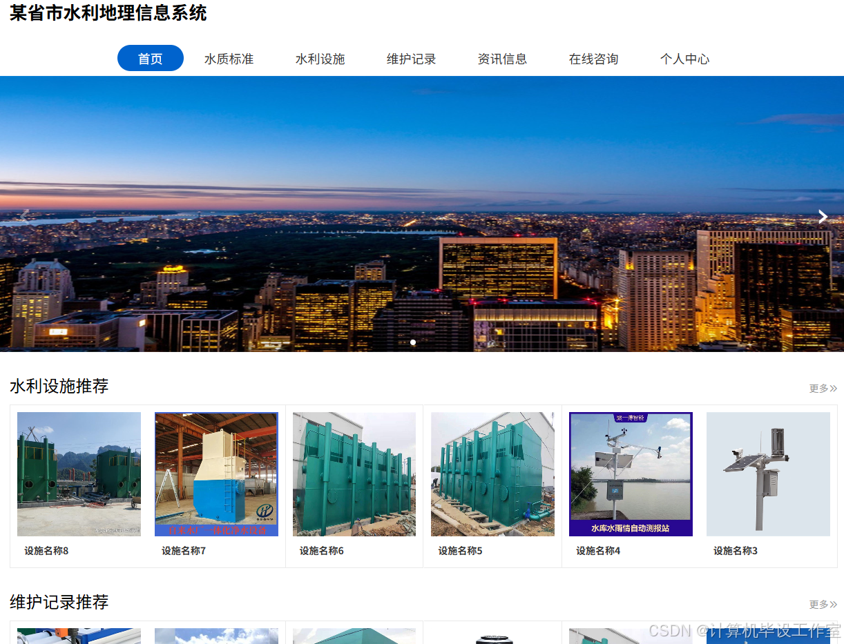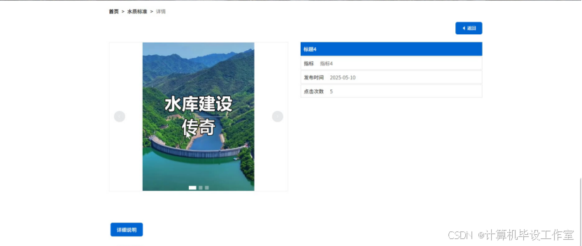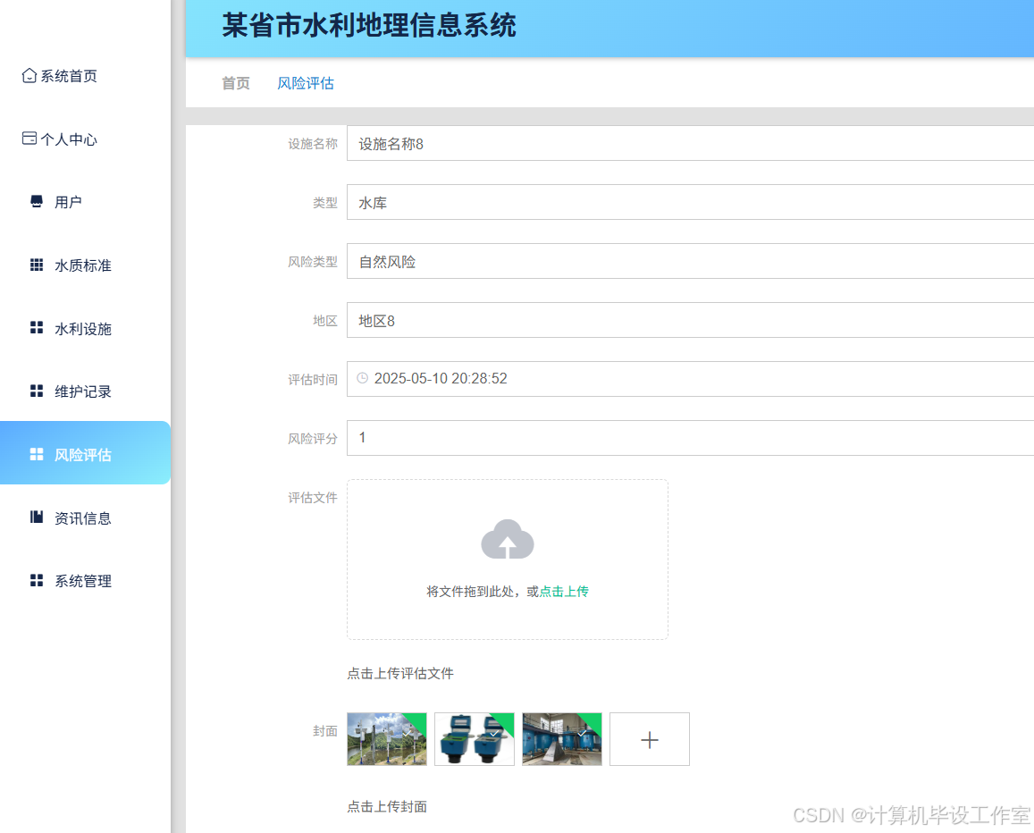 该系统基于 Java 开发,采用 SpringBoot+Vue 框架,适用于计算机毕业设计 / 课程设计,含源码、数据库、毕业论文及答辩 PPT。系统分用户、管理员两类角色:用户可登录系统,浏览首页导航栏,查看系统资讯、水质标准,检索水利设施,登记设施日常维护记录,提交风险评估;管理员凭固定账户密码登录,可管理用户(编辑、更新、查询),在个人中心修改资料与密码,编辑发布水质标准,管理水利设施,查看
