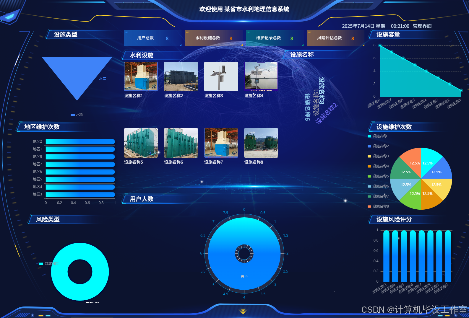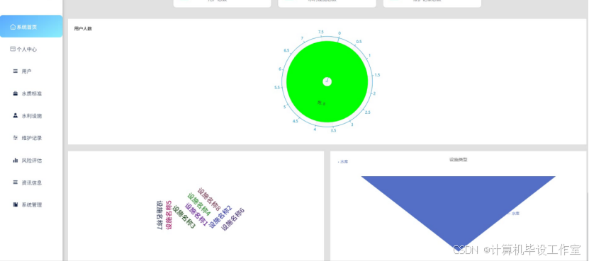 管理员输入账户和密码进入系统后,在首页界面可以对水利设施、类型、设施容量、设施维护次数内容等进行统计、以图表的形式直观体现。管理员首页界面如图5-8所示。
