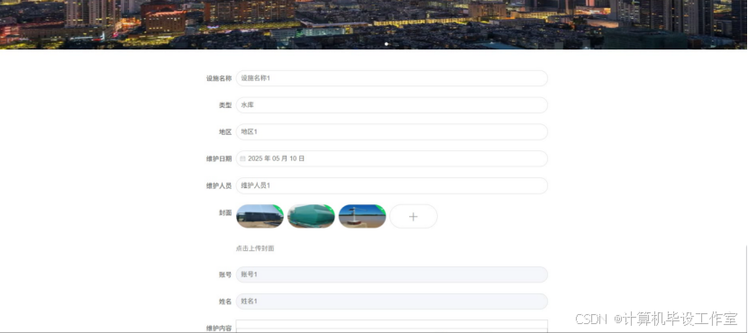 在维护记录模块中,用户可以上传日常对于水利设施的维护登记,包括设施名称、类型、地区、维护内容、维护人员信息等。维护记录界面如图5-5所示。