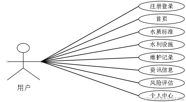 用户可以点击界面登录入口输入用户的个人账号、登录密码以及验证码进入系统;浏览首页界面中的用户功能导航栏;查看系统资讯内容;点击了解水质保准内容;查看和搜索水利设施;进行水利设施的日常维护记录登记;进行风险评估提交。用户用例图如图3-1所示。