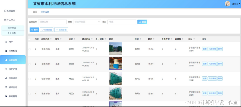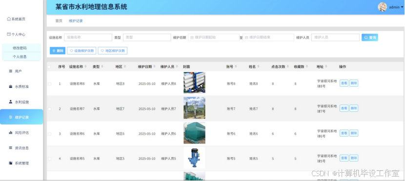 在当前环境保护与资源管理日益受到重视的情况下,某省市由于其特殊的地理环境和经济发展需求,对水资源的科学管理提出了更高的要求。开发水利地理信息系统旨在通过现代信息技术手段,实现对该省市水资源状况及其相关设施的全面监控与管理。该系统前端采用Vue.js,后端使用SpringBoot,数据库选用MySQL,主要的功能模块涵盖了水质标准监测、水利设施分布与状态显示、维护记录跟踪、风险评估及资讯信息发布等多个方面。其中,水利设施模块则支持用户查看各类设施的具体位置、运行状态等信息,便于进行日常管理和维护工作;维护记录功能确保每一次维护活动都有据可查;风险评估工具可以帮助决策者预测潜在的风险因素;通过对水质数据的实时监测和分析,系统能够快速响应并处理水质异常情况。