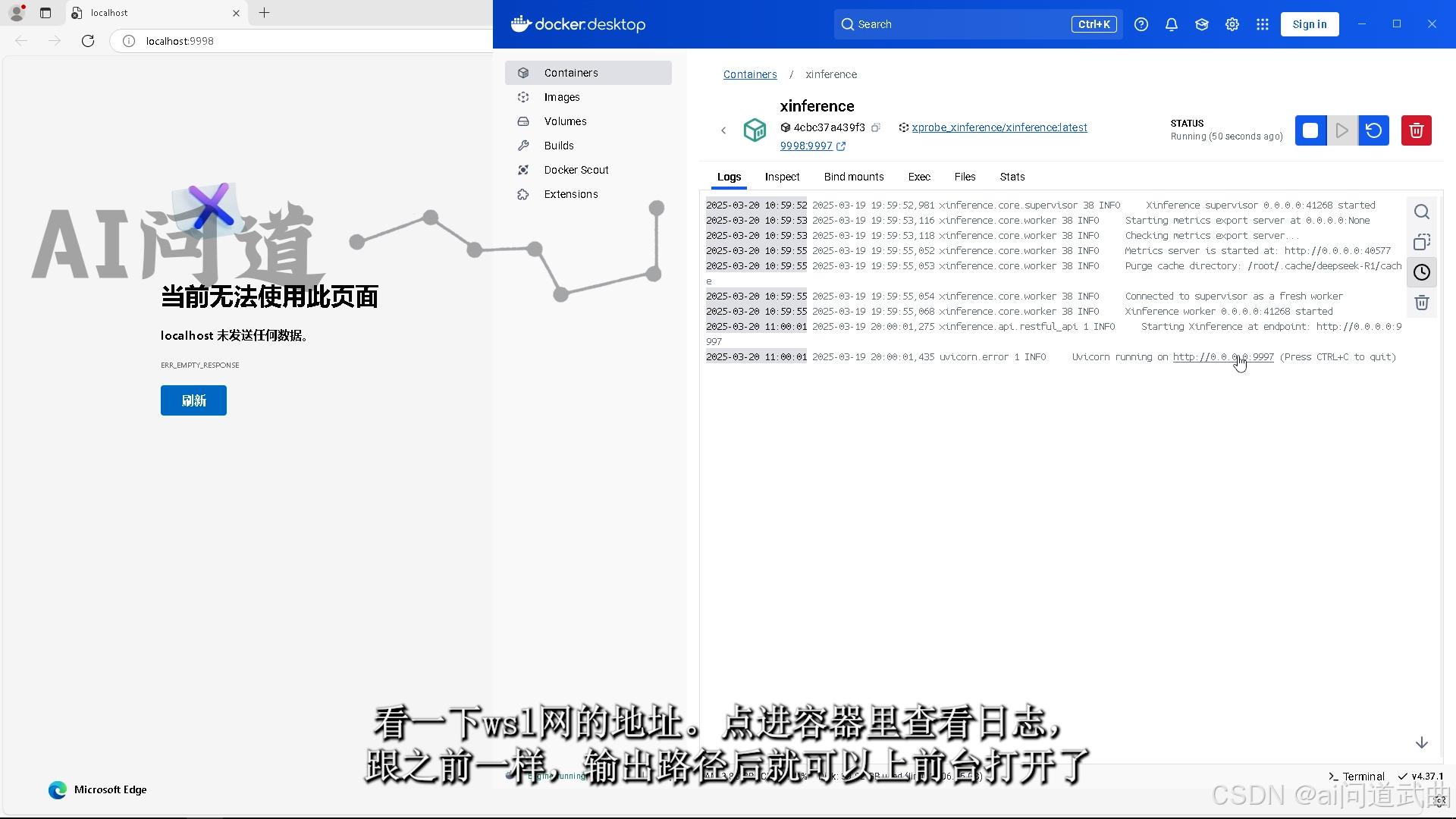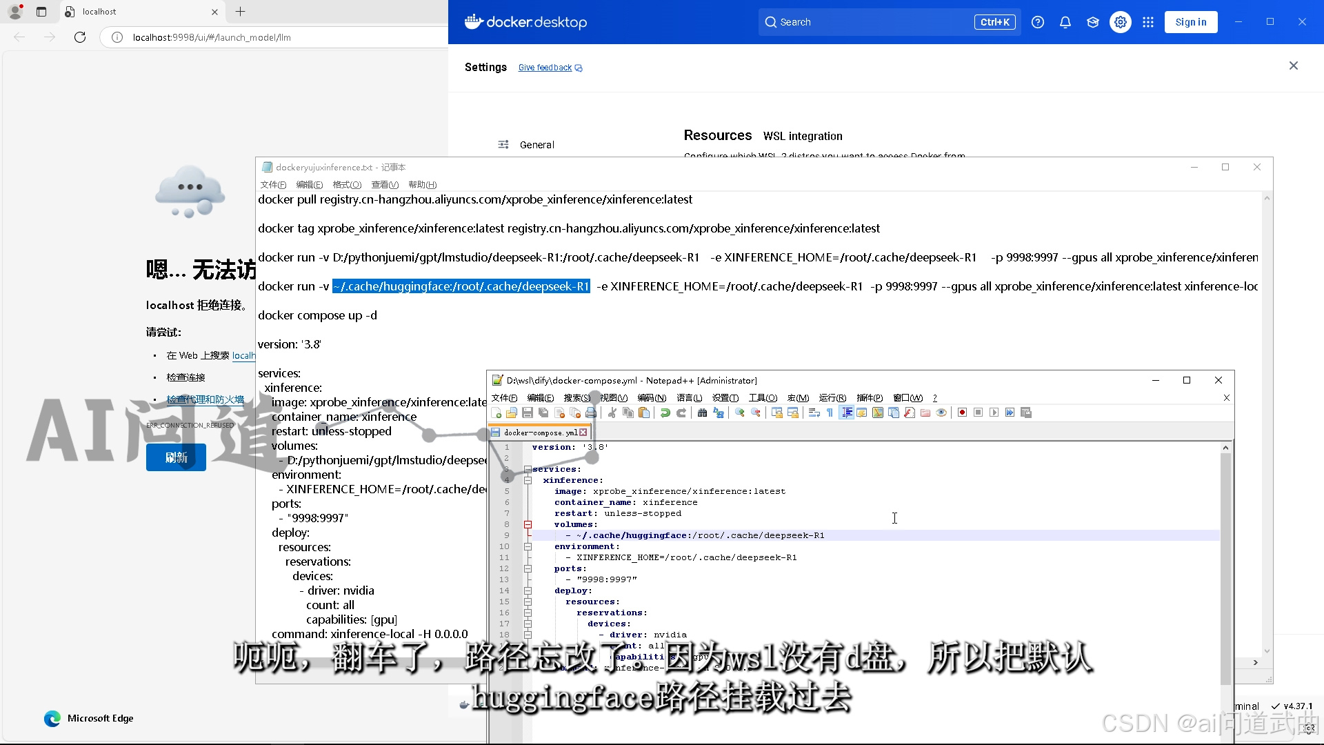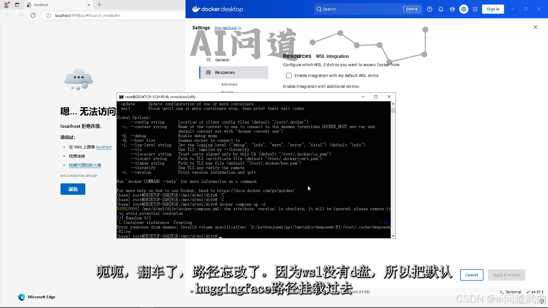 跟win一样,在yml文件夹下运行,docker compose up -d。呃呃,翻车了,路径忘改了。因为wsl没有d盘,所以把默认huggingface路径挂载过去。