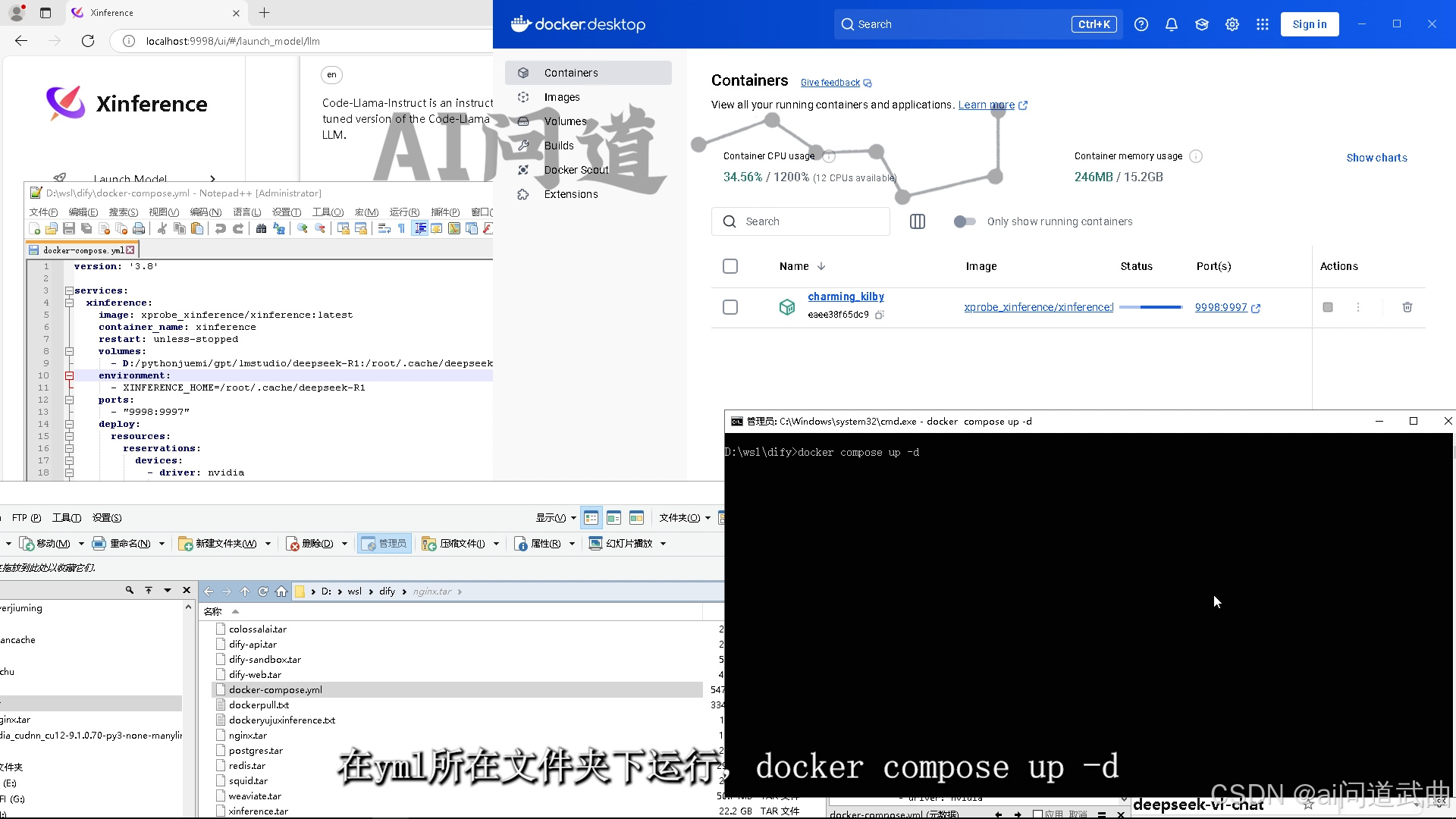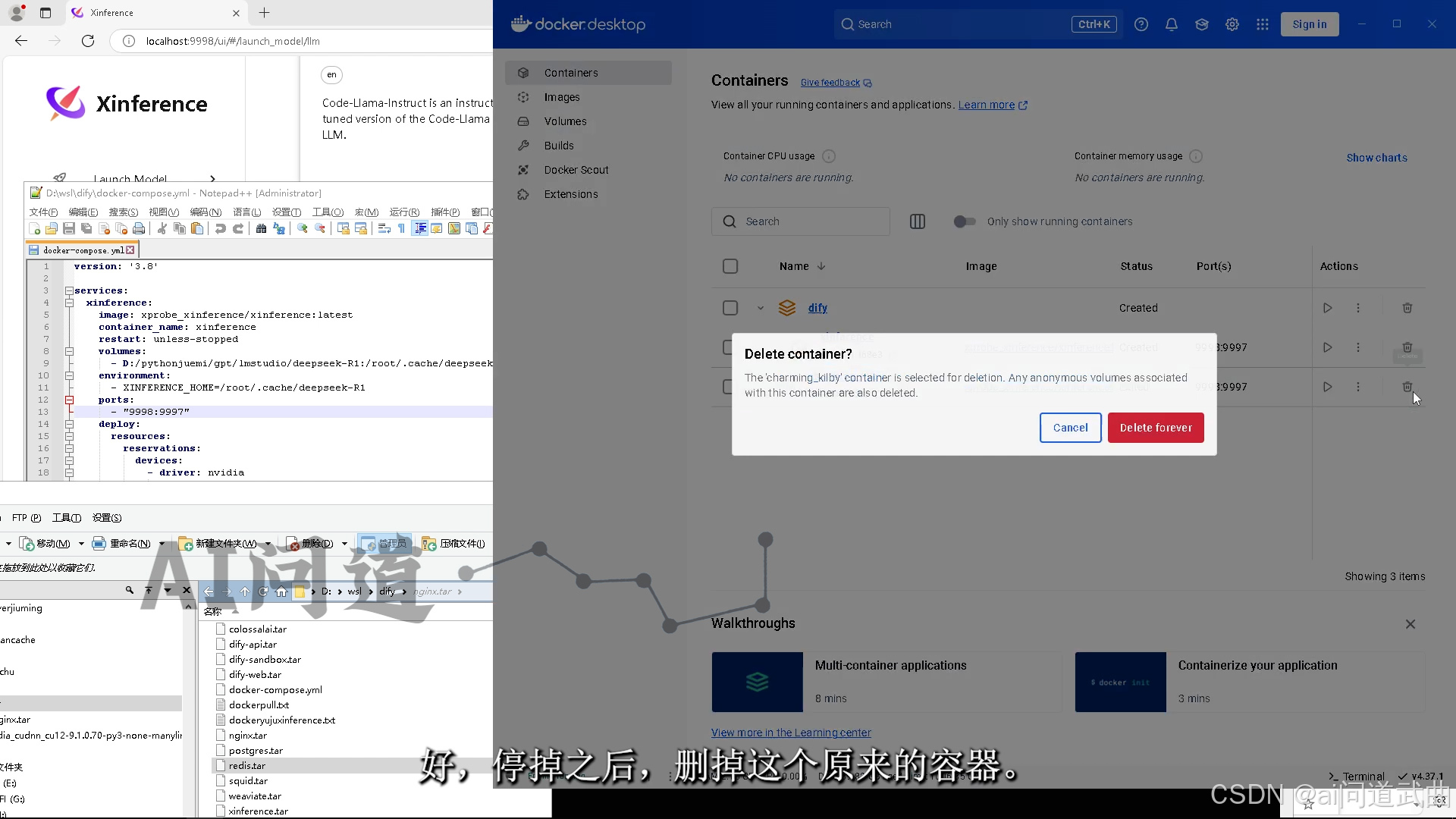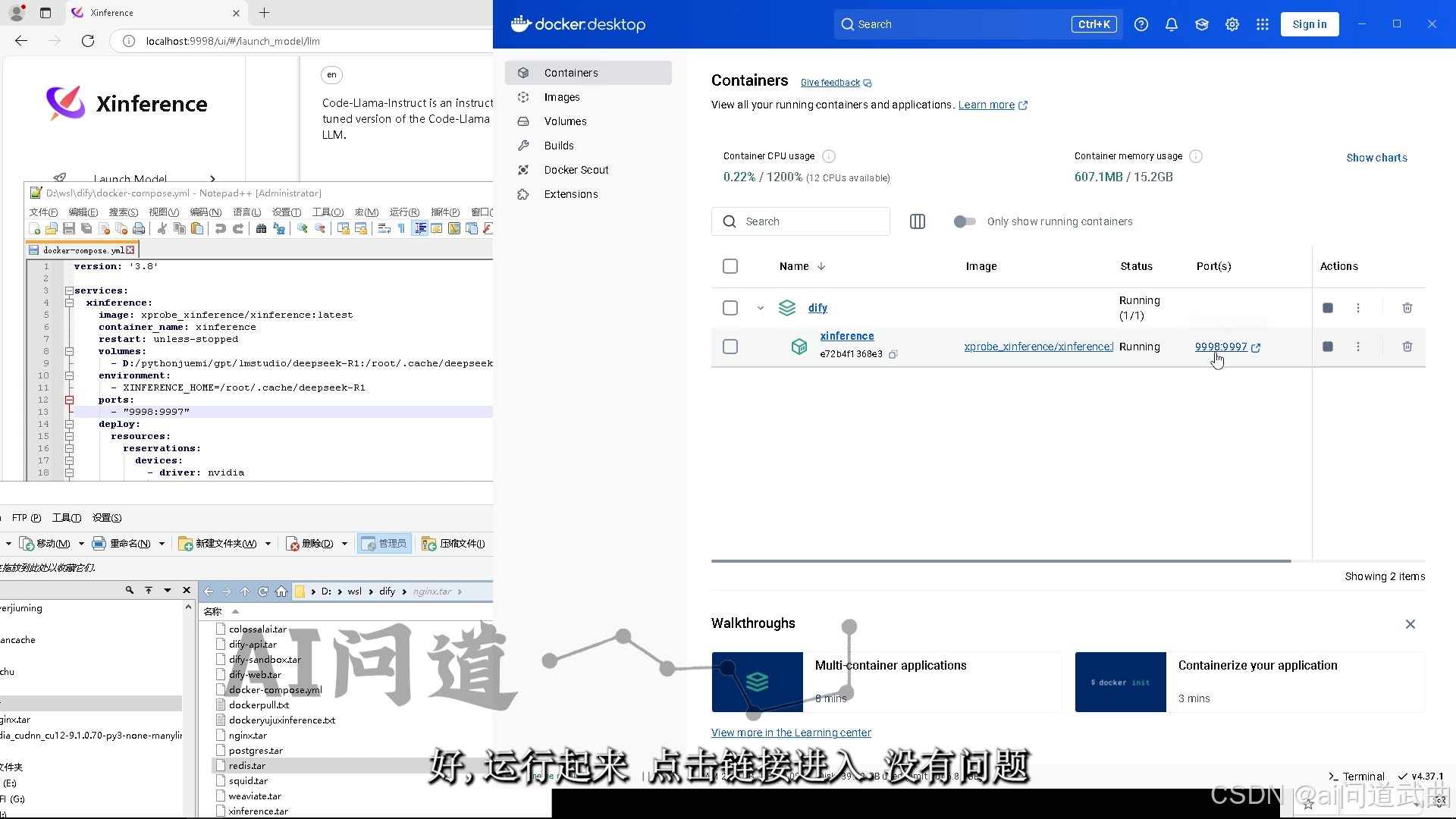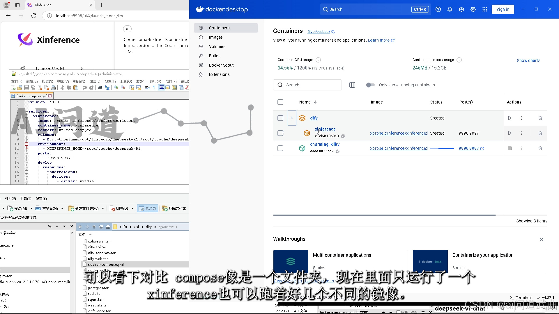 可以看下对比,compose像是一个文件夹,现在里面只运行了一个xinference,也可以跑着好几个不同的镜像。
