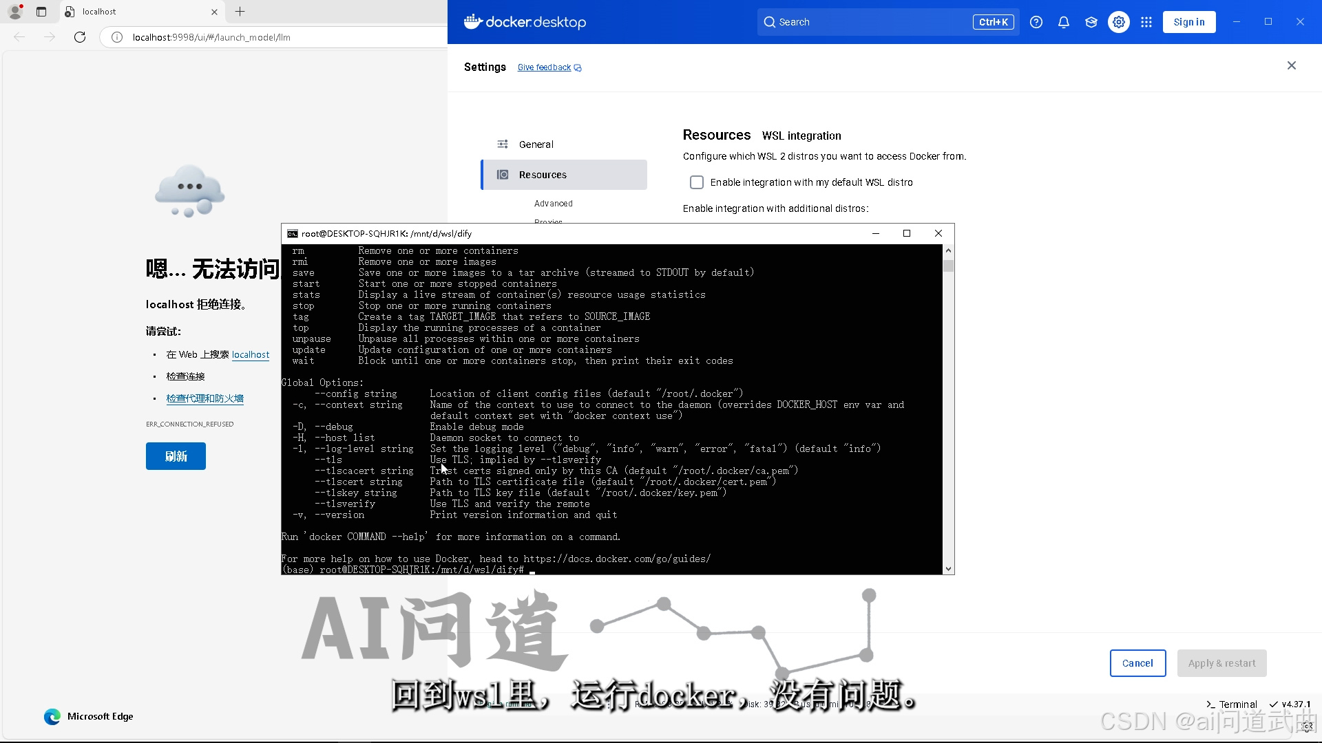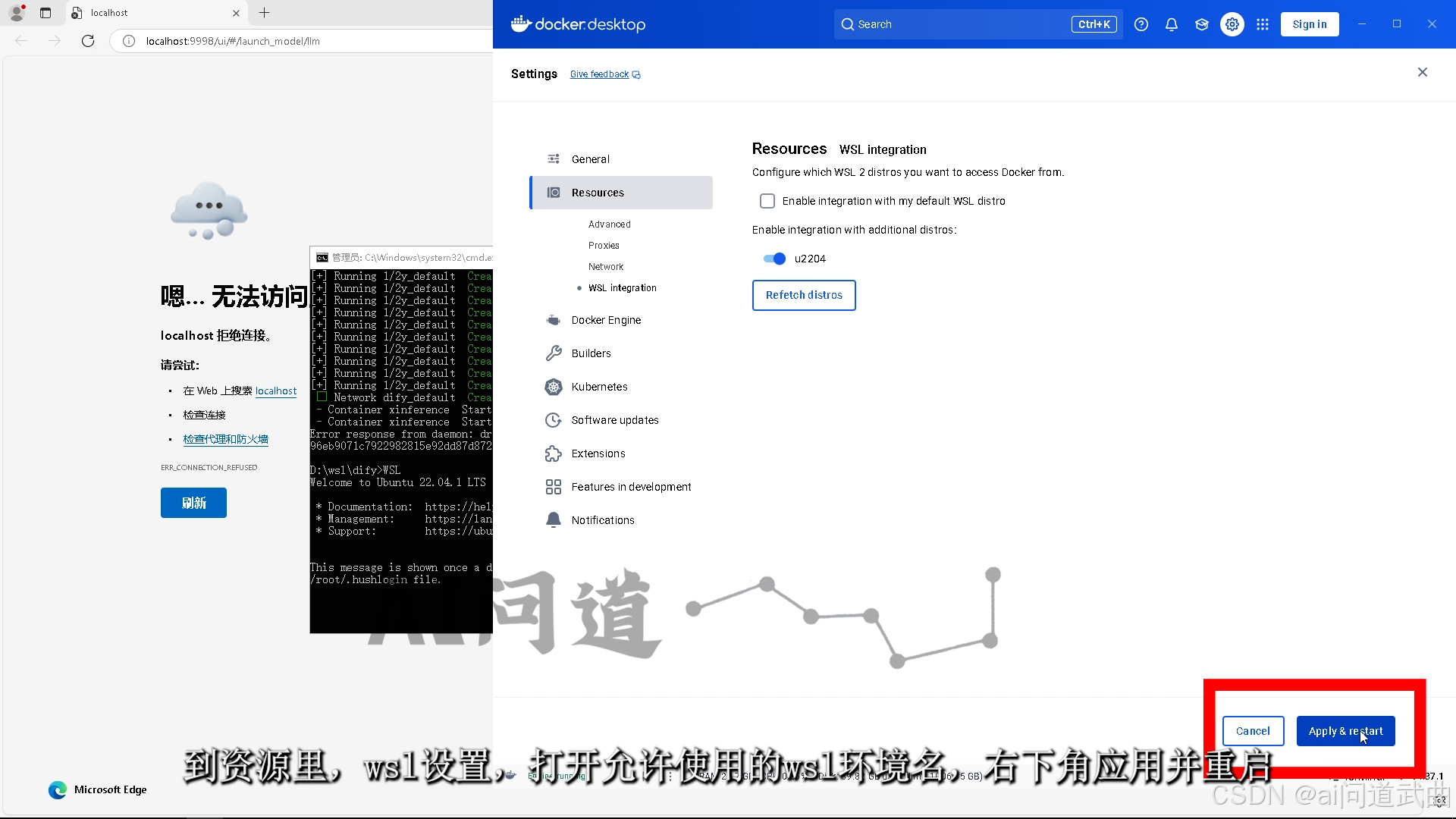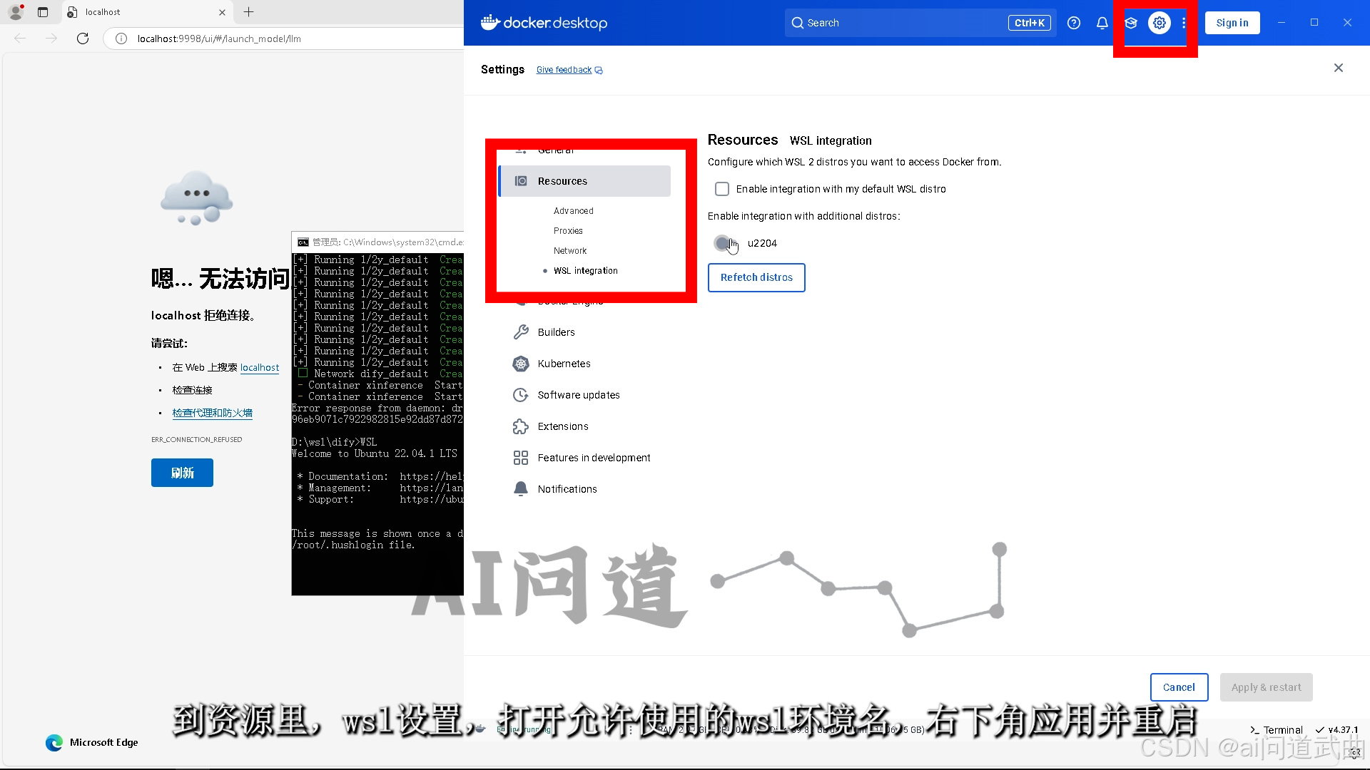 好,下面讲wsl,这次直接删了这个容器包。命令行进入wsl。docker里点这个小齿轮,到资源里,wsl设置,打开允许使用的wsl环境名,右下角应用并重启。