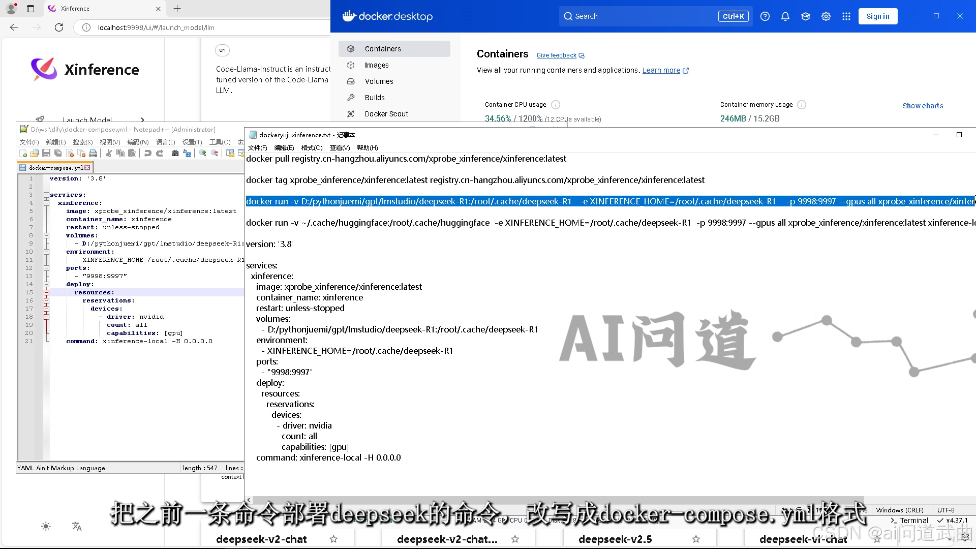 docker run -v D:/pythonjuemi/gpt/lmstudio/deepseek-R1:/root/.cache/deepseek-R1 -e XINFERENCE_HOME=/root/.cache/deepseek-R1 -p 9998:9997 --gpus all xprobe_xinference/xinference:latest xinference-local -H 0.0.0.0