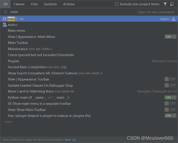 CLion的自动提示功能如下:CLion的参数提示功能如下:CLion的形参名称显示功能:点击搜索安装,或者双击Shift,可以搜索任何地方的任何东西。可以在这里进行一些主题、插件、快捷键映射等快速设置。侧边工具栏有:代码结构、代码标签、IDE通知窗口、数据库窗口。这里我创建了git仓库,并提交了一次commit,但这些git操作并不属于本文内容。CLion可以搜索哪里进行了变量的读访问操作,哪里