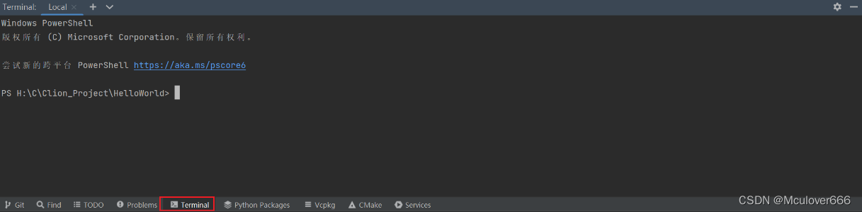 CLion内置了MinGW,点击运行可以一键编译运行,运行结果显示在底部: