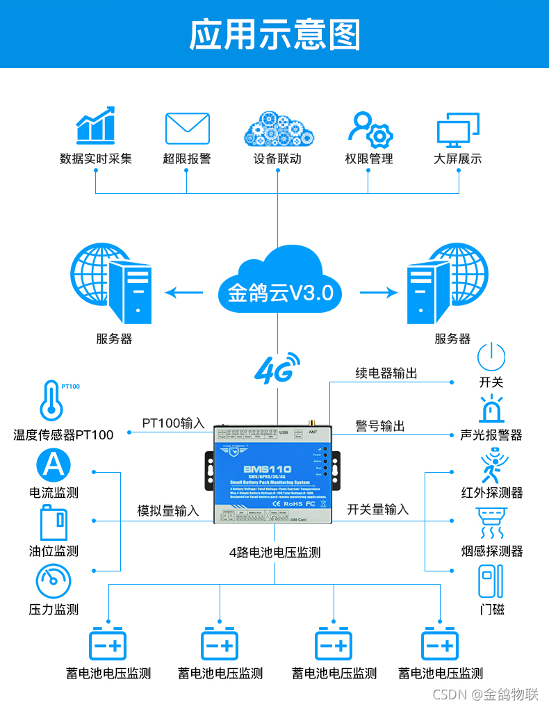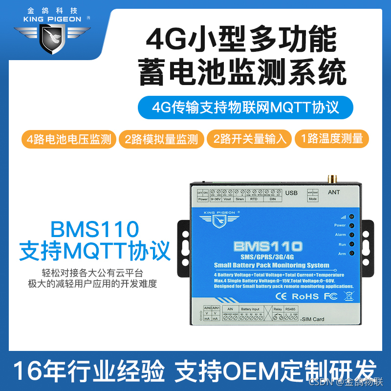 小型蓄电池组监测报警系统BMS110是一款多功能可编程的小型电池组数据监测采集控制终端,用户可以通过APP、Web界面直接远程监测单体电池电压、电池组电压、电流以及温度、控制逆变器等。专为太阳能供电系统、基站备用电源、小型机房备用电源系统、电动车充电系统监测等场景设计。