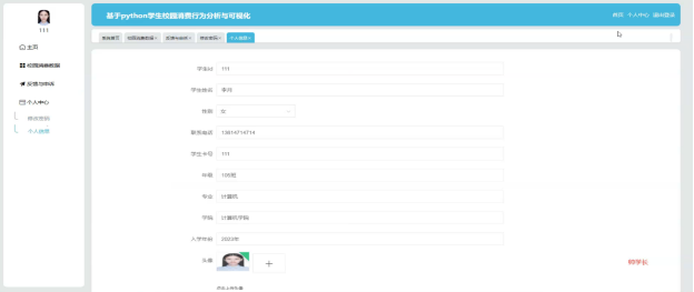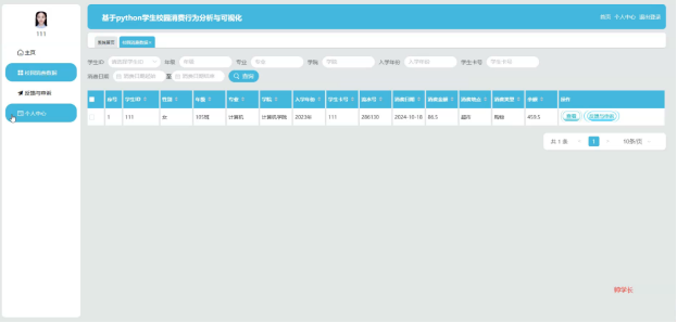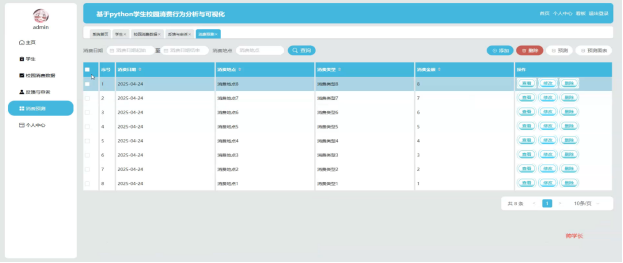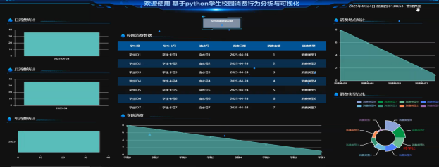 As the digitalization of campuses accelerates, students 'consumption behaviors on campus have become an important basis for understanding their living habits and optimizing resource allocation. By analyzing and visualizing students' campus consumption data, school management efficiency can be effectively improved, promoting the rational distribution of resources and providing data support for formulating more scientific student support policies. This project has developed a system based on Python, focusing on the analysis and visualization of students' campus consumption behaviors. Using Django as the backend framework and MySQL database for data storage, it achieves full automation from data collection to predictive analysis.