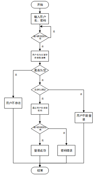 用户输入用户名和密码后,系统先检查输入是否为空,再验证用户名是否存在,若存在则通过用户名获取密码并校验。若密码正确则登录成功,否则提示密码错误。若用户名不存在或无法登录,提示用户操作无效。如下图所示。