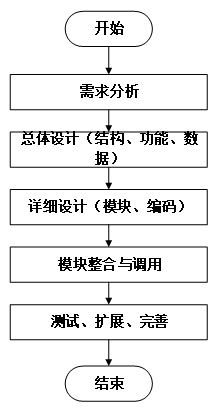 系统开发流程的主要步骤,从需求分析到系统完成的全过程。流程包括需求分析、总体设计(结构、功能、数据)、详细设计(模块、编码)、模块整合与调用,以及测试、扩展和完善,最终完成系统的开发。本系统的开发流程如下图所示