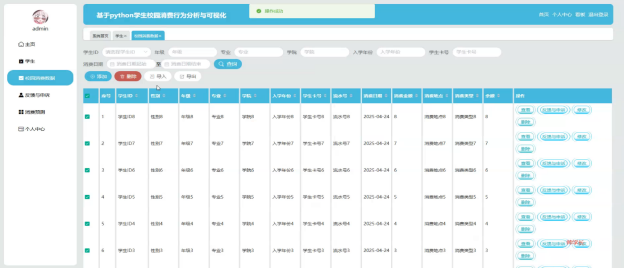校园消费数据:管理员可以对校园内的消费数据进行详细管理,包括添加新的消费记录、删除错误或过时的数据、查询特定消费记录、修改现有记录、查看消费数据详情、导入和导出数据文件,以及处理学生的反馈与申诉。