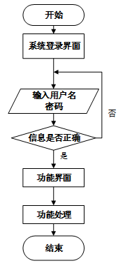 用户首先进入系统登录界面,输入用户名和密码后,系统验证信息是否正确。若验证失败,返回登录界面重新输入,若验证成功,则进入功能界面,执行相应功能处理后结束操作流程。操作流程如下图所示。