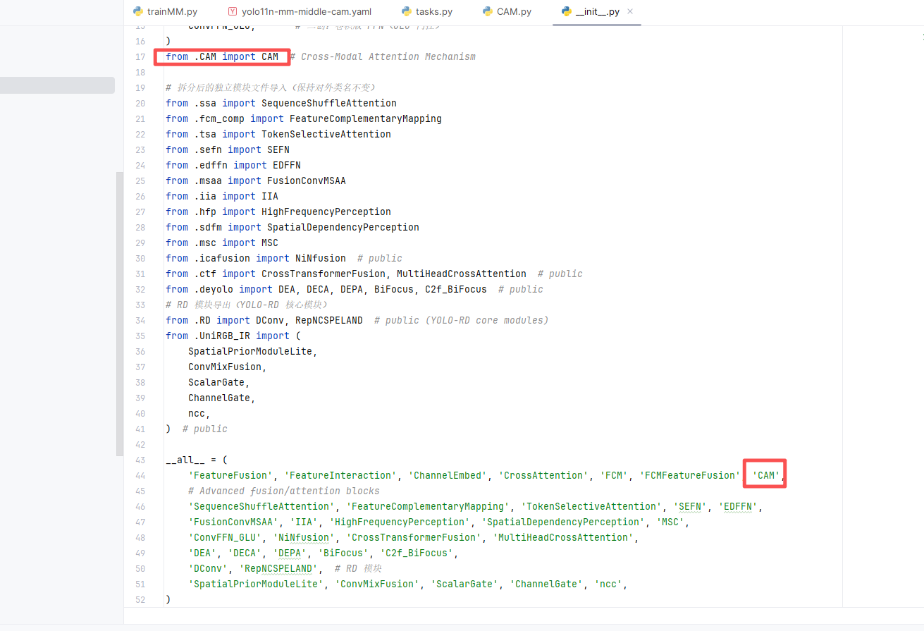 第三步:找到 ultralytics/nn/tasks.py 文件,在其中完成我们模块CAM的导入和注册(如果使用的是我提供的项目工程,该文件已自带,无需新建)。具体书写方式如下图所示