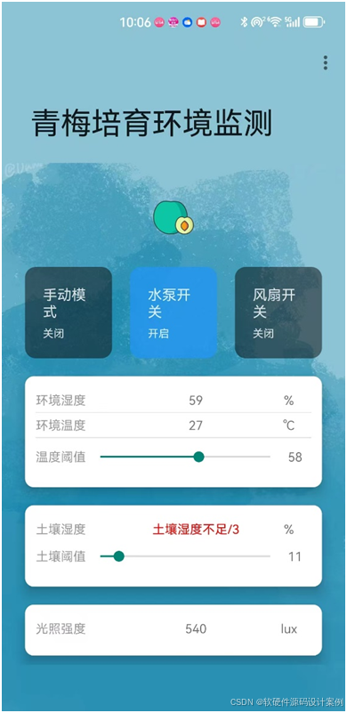 - 水泵:可以设置土壤湿度阈值,控制水泵的开启和关闭,自动模式下,可以由阈值自动控制
