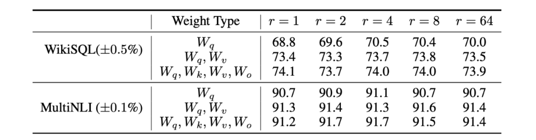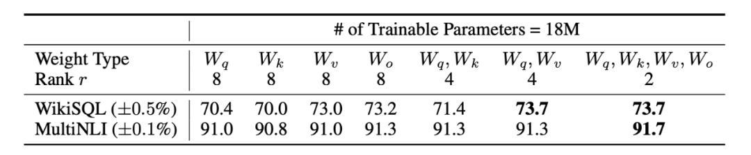 在大模型的自注意力层,可训练的参数有四个 ,通过变化矩阵的秩 r,保持可微调的参数总量为18M,分别在两个任务上进行测试。从实验结果上看,当r=4时,仅对 矩阵微调后效果最优,当r=2时,对四个矩阵微调,效果最优。