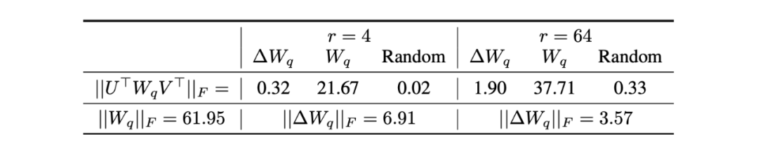 在两种不同的任务上,分别设置三组对照实验,矩阵的秩从 1到64。实验发现在参数矩阵 ,进行LoRA微调,即使矩阵的秩 r=1也取得了和大秩矩阵 r=64 一样的效果。表明在可微调的参数矩阵中,存在内在秩“intrinsic rank”的假设,表明较小的秩也可以充分的表示模型中突出信息,增大矩阵秩 r 并没有覆盖到矩阵中有用的信息。