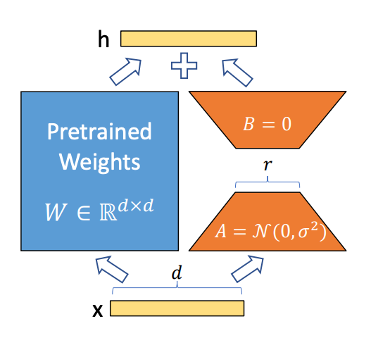 从参数量对比,原来直接更新的参数量是,而采用 LoRA 后, A 和 B 的总参数量为 ,当 r 取值较小时,参数量大幅减少。