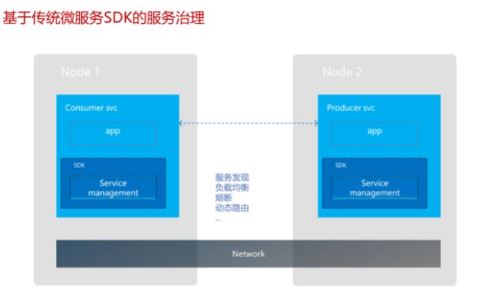 原理就是提供了开发的SDK或者说叫框架,这些框架都是内置了一些解决微服务问题的方案,比如服务发现,负载均衡,服务的熔断和降级,以及调用链路的埋点,动态路由这些事情。