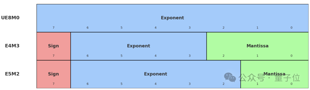 而这里的“缩放因子”也是包含8个bit,其中包含符号位、指数位和尾数位,开发者可以自行将这8个bit分配给这三种不同的位。