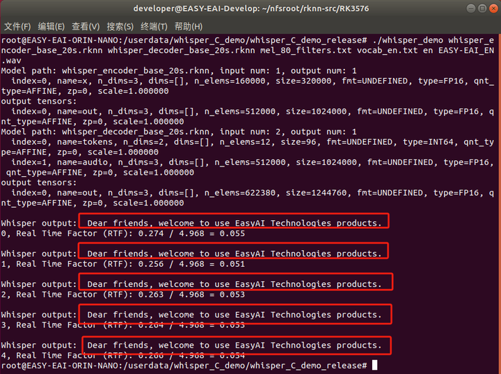 本小节展示Whisper模型的在EASY EAI Orin-nano的部署过程,本章章节使用解码模型whisper_decoder_base_20s.rknn和编码模型whisper_encoder_base_20s.rknn。