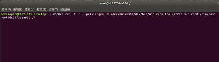 执行以下指令把工作区域映射进docker镜像,其中,/home/developer/rknn-toolkit2/model_convert_test为工作区域,/test为映射到docker镜像,/dev/bus/usb:/dev/bus/usb为映射usb到docker镜像