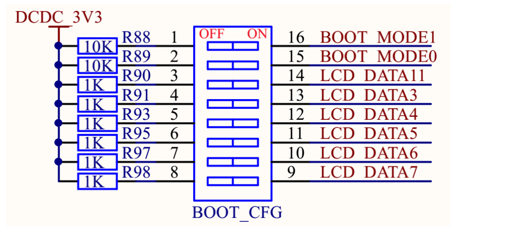 在 上图 中 , 除 了 BOOT_MODE1 和 BOOT_MODE0 必 须 引 出 来 , LCD_DATA3~LCDDATA7、LCD_DATA11 这 6 个 IO 也被引出来了,可以通过拨码开关来设置