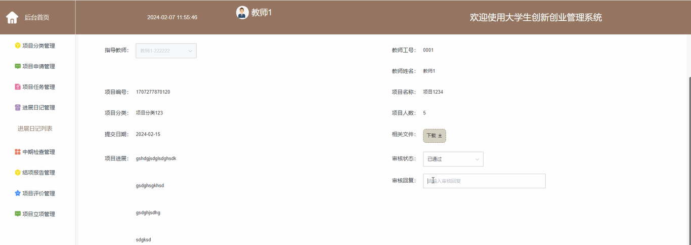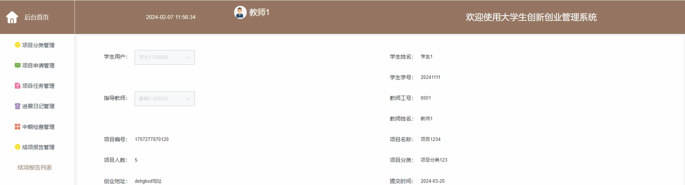 This system uses Spring Boot as the development framework, which has the advantages of fast development and easy expansion. The system mainly includes project task management, project schedule management, project evaluation management, project management and other modules. Students can publish and manage their own innovation and entrepreneurship projects through the system, upload and share related resources, accept teachers and experts review and audit, and show their results in the system.