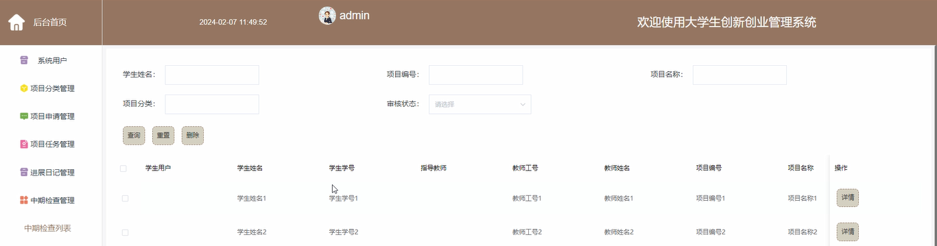 中期检查管理:管理员点击可查看中期检查列表。界面如下图所示。