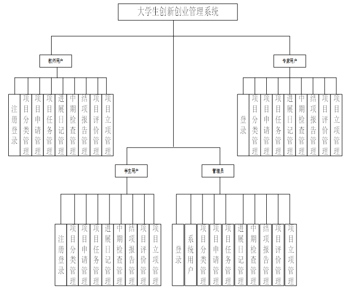 大学生创新创业管理系统的开发主要是提高管理效率,所以在系统的功能方面我们首先要从系统管理者的角度进行确保能够满足每个用户的需求,因此在功能上主要规划了管理员功能模块、学生用户功能、教师用户模块和专家用户功能模块四部分。