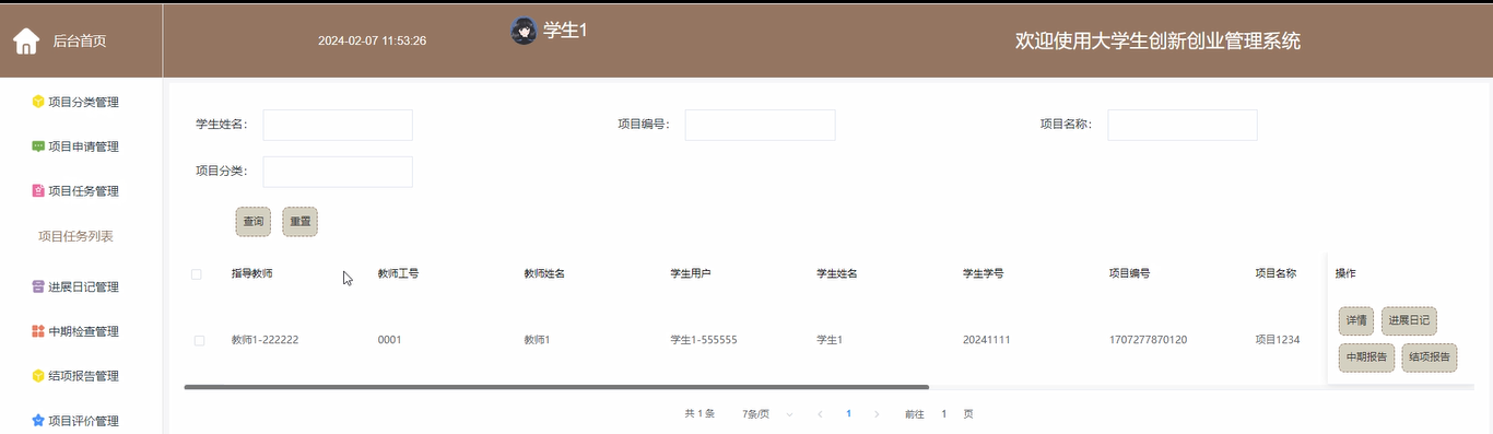 项目任务管理:学生点击可查看项目任务列表,在教师进行任务分派后,可以进展日记、中期报告和项目报告进行填写。界面图如下。