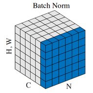 如图中,N表示样本轴(batch大小), C表示通道轴, H,W是每个通道的特征数量,BN是取不同样本的同一个通道的特征做归一化。