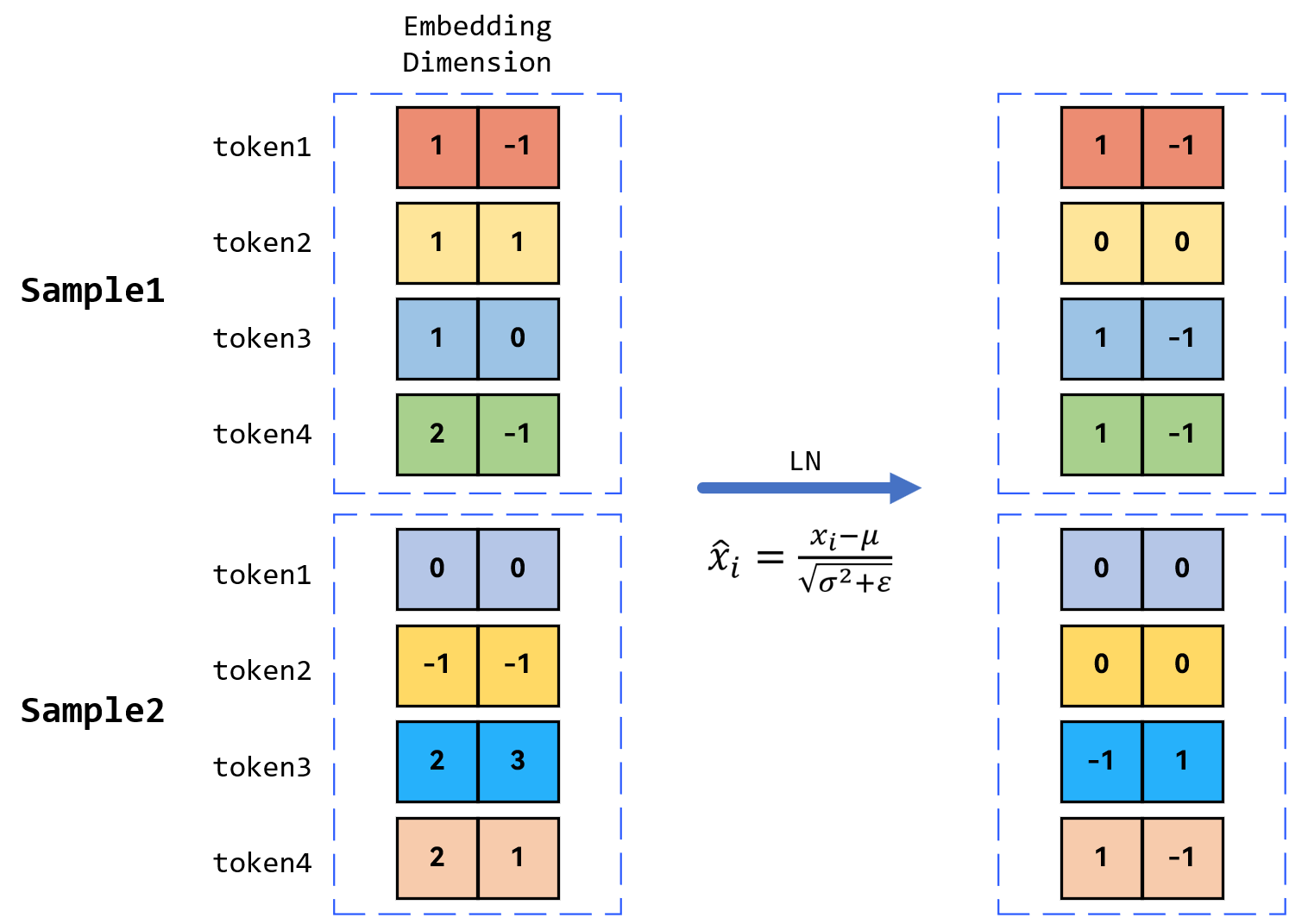 对于输入,有样本1和样本2,即Sample1和Sample2,每个样本有四个字,即4个token,或者叫sequence_len,每个字的Embedding有自己的维度,即embedding dimension。那么LN规则化其实就是对每个样本的每一个token的embedding dimension求均值和方差,然后运算。图中相同颜色的格子就是做LN规则化的。