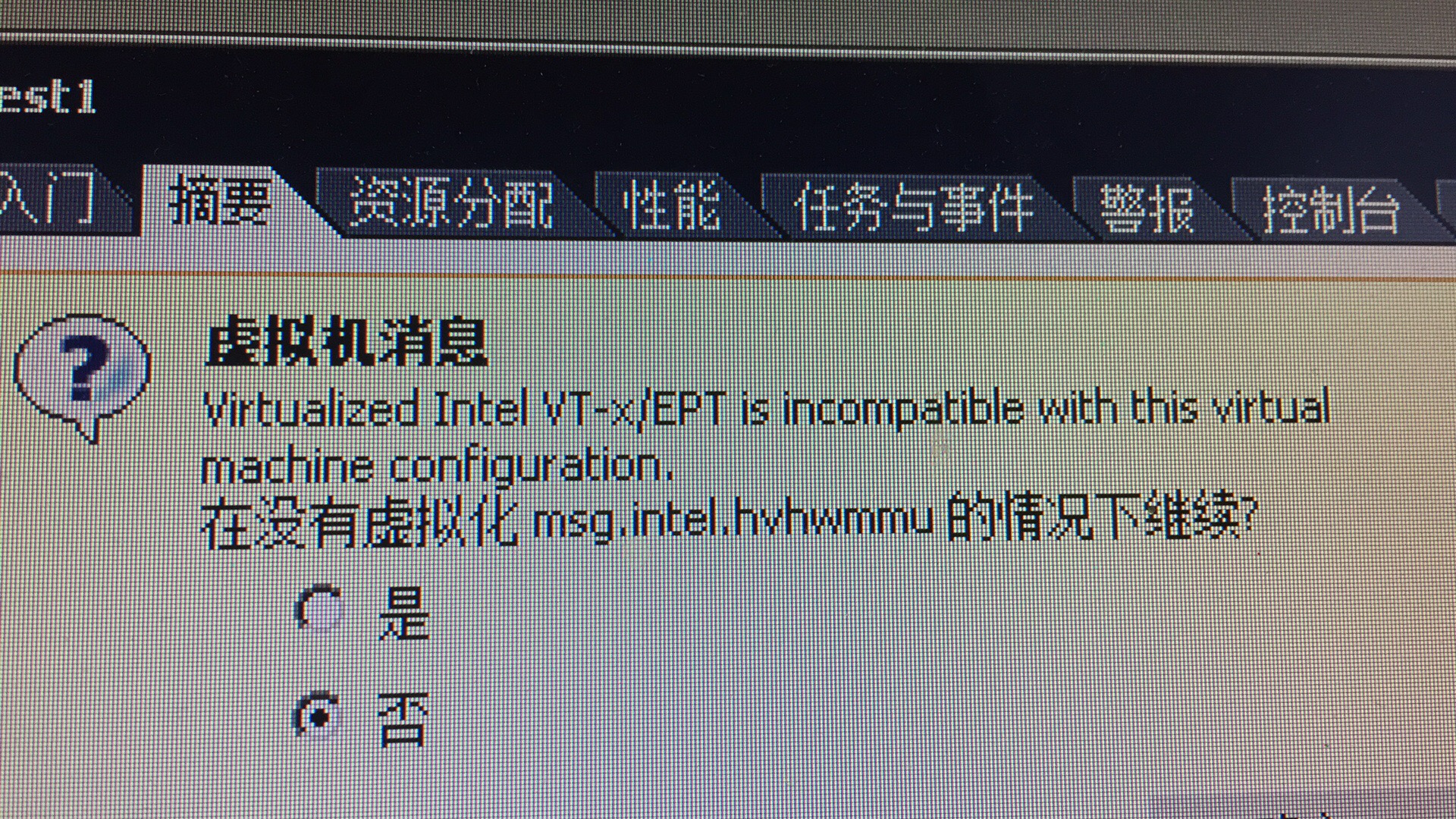 Virtualized Inter VT-x/EPT is incompatible with this virtual machine configuration在没有虚拟化msg.inter.hvhwmmu的情况下继续?是否解决办法:升级虚拟机的硬件版本即可解决转载于:https://www.cnblogs.com/bainianminguo/p/7484994...