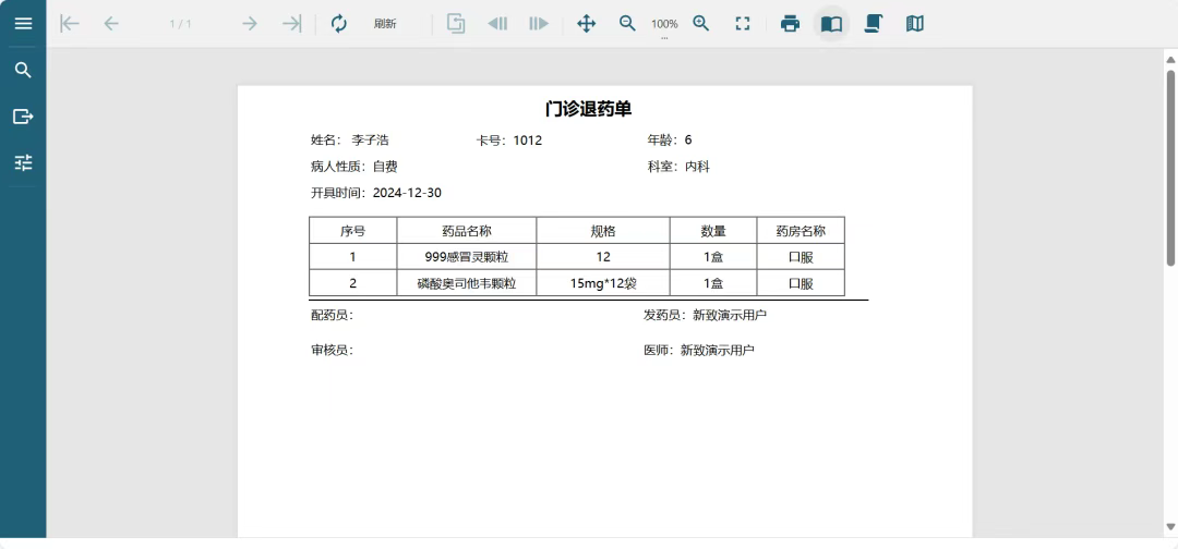 弹出门诊退药单。