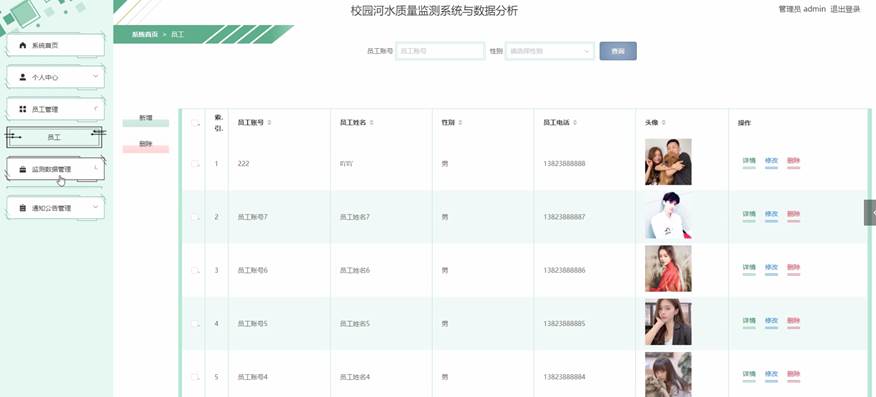 管理员点击员工管理;在员工管理页面对员工账号、员工姓名、性别、员工电话、头像等信息,进行查询,新增或删除员工信息等操作;如图4-3所示。
