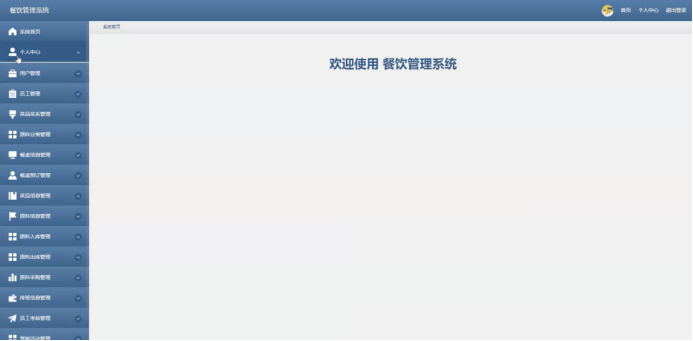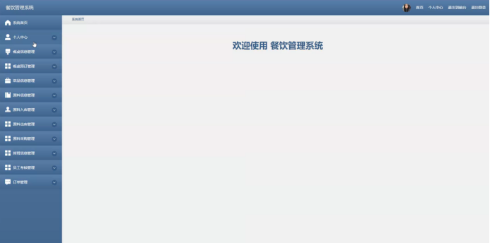 员工进入主页面,主要功能包括对个人中心、餐桌信息管理、餐桌预订管理、菜品信息管理、原料信息管理、原料入库管理、原料出库管理、原料采购管理、排班信息管理、员工考核管理、订单管理等进行操作。员工主页面如图5-12所示: