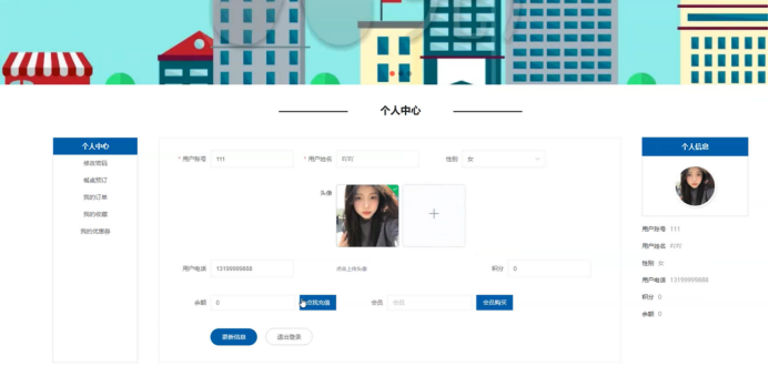 个人中心:修改密码、头像、余额充值、积分查询、我的优惠券、我的收藏、我的预订